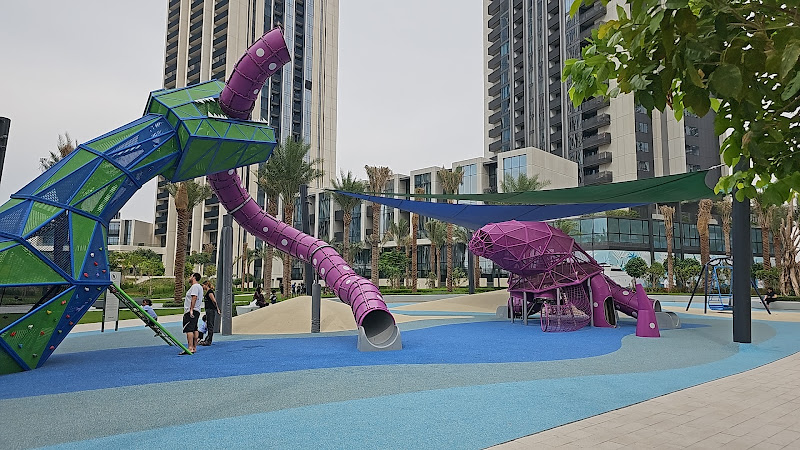 Central Park offers a thematic playground experience with multiple play areas designed for children of different ages. The park features various playground equipment set within green spaces, providing a safe outdoor environment for kids to play and explore. Public facilities including toilets are available for families.