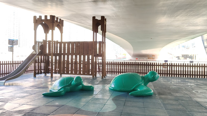Located under the bridge at Dubai Marina, this compact playground provides slides and play equipment for children along the popular Marina Walk. The shaded location offers relief from the sun while kids play, with benches for parents to rest. The playground sits conveniently between the walking path and water views on both sides.