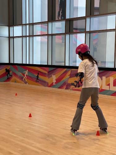 Indoor roller skating facility offering lessons for children of all skill levels with professional coaches in a mall setting.